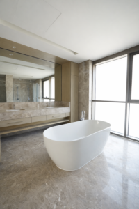 Primary Suite: A sleek, modern space featuring twin floating wooden vanities with stone countertops, paired with elegant mirrors and warm accent lighting. Natural textures, clean lines, and a balanced layout create a luxurious ambiance.