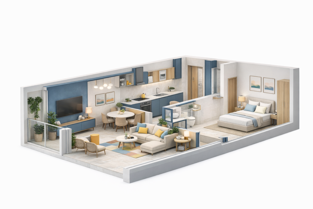 Open-Concept Living Room: living room is designed as a refined, open-plan space that balances elegance with comfort. Expansive floor-to-ceiling windows flood the area with natural light while offering uninterrupted sea and skyline views. Soft neutral tones are complemented by warm wood accents, natural stone surfaces, and subtle metallic details, creating a calm yet sophisticated ambiance.