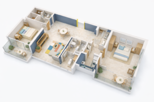 Primary Suite: The bedroom is bright and thoughtfully designed to create a calm, comfortable retreat. Large floor-to-ceiling windows frame stunning waterfront views and allow abundant natural light to fill the space throughout the day. A soft, neutral color palette is complemented by warm accents, elegant textiles, and contemporary furnishings. Built-in wardrobes provide seamless storage, while layered lighting and refined finishes enhance the sense of modern luxury and everyday comfort.