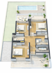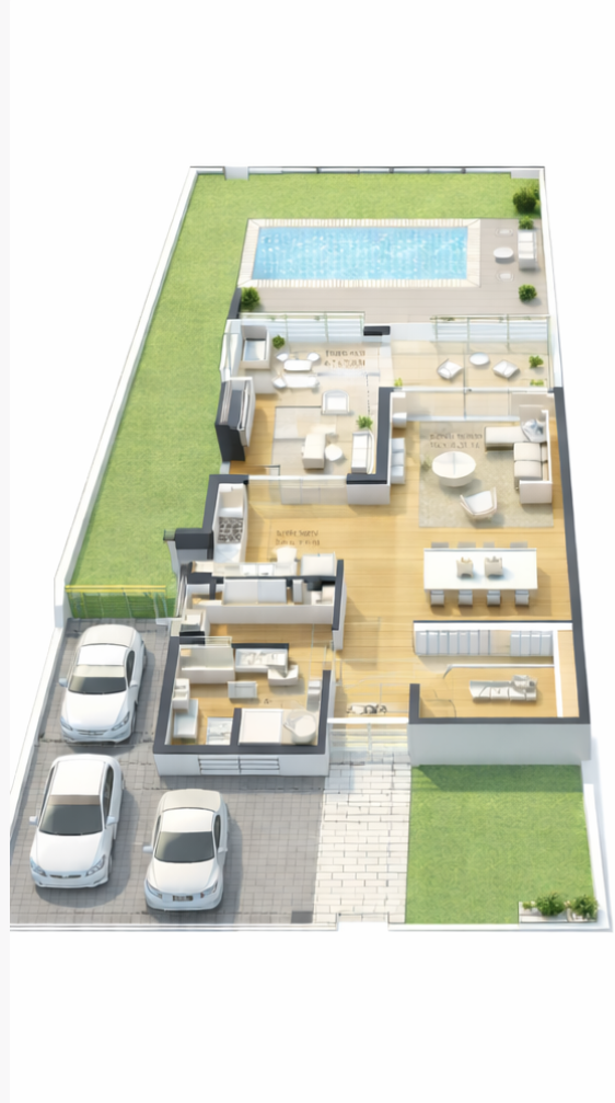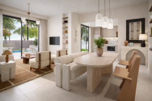 The interior is thoughtfully designed to reflect a sense of calm sophistication and modern comfort. An open-plan layout connects the living, dining, and kitchen spaces, allowing natural light to flow freely through large glass doors. Soft neutral tones, warm wood finishes, and textured materials create a welcoming and elegant atmosphere. Contemporary furnishings and clean architectural lines are complemented by subtle decorative accents, resulting in a refined yet inviting living environment that balances style with everyday functionality.
