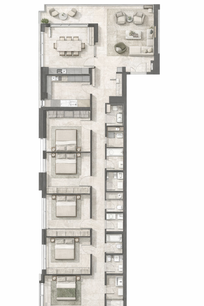Rosewater brings together exceptional structural quality, contemporary design, and elegant interiors finished to the highest standards. Each building features a unique façade, reflecting a refined waterfront lifestyle tailored to those who appreciate sophisticated urban living. An elegant communal inner plaza and views toward the pristine 700-metre beach just a short walk away enhance the sense of openness and connection. Impeccably planned residences maximize space and natural light, with light-filled living areas, bedrooms, and balconies complemented by high-spec details that deliver understated luxury for discerning buyers.