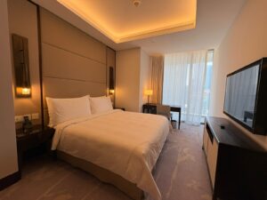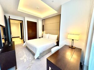 The bedroom exudes understated luxury with a calm, elegant ambiance. A plush king-size bed with a softly upholstered headboard takes center stage, dressed in crisp white linens that enhance the sense of comfort and refinement. Warm neutral tones are layered with rich wooden accents, while recessed ceiling lighting and bedside lamps create a soft, relaxing glow. Floor-to-ceiling curtains frame the space, allowing natural light while maintaining privacy, and a sleek writing desk and seating area add both functionality and sophistication to this serene retreat.