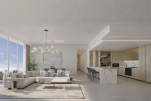 Living Room:   This elegant open-plan living space blends clean modern design with soft natural elements, creating a warm and inviting atmosphere. Floor-to-ceiling windows flood the interior with natural light while opening onto expansive views and an outdoor seating area. The living and dining areas flow seamlessly into a contemporary kitchen with refined finishes and a sculpted island
