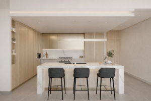 The interior is defined by a refined, contemporary aesthetic that balances minimalism with warmth. Soft neutral tones are layered with natural textures, including stone surfaces and wood finishes, creating a calm and cohesive environment. Open-plan layouts enhance spatial flow, while floor-to-ceiling glazing brings in abundant natural light and frames expansive views. Thoughtfully integrated lighting, clean lines, and bespoke detailing elevate the overall sense of sophistication.