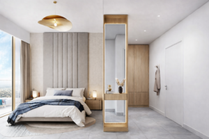 Primary Suite: The bedroom is a serene and well-proportioned retreat, designed to capture breathtaking sea views through expansive floor-to-ceiling windows. Soft neutral tones, warm textures, and subtle lighting create a calm and inviting ambiance, while the generous layout allows for effortless comfort.closet offers ample storage and seamless organization without compromising the room’s elegance. The attached washroom is finished with refined stone surfaces and sleek fittings.